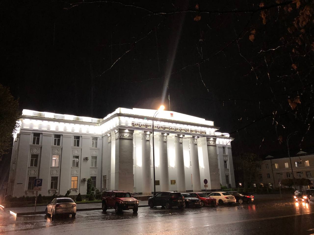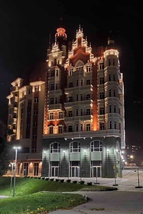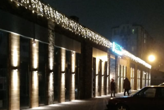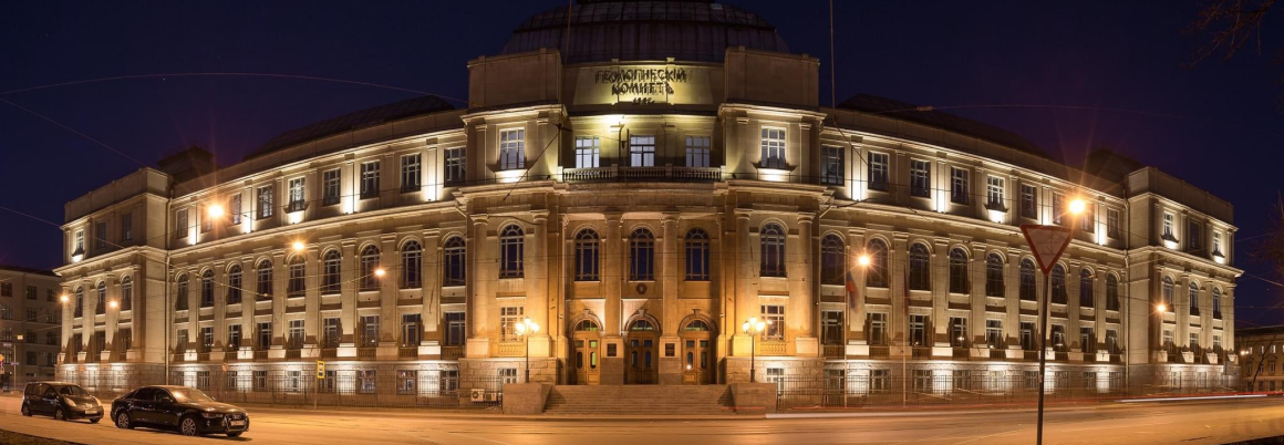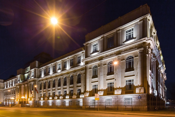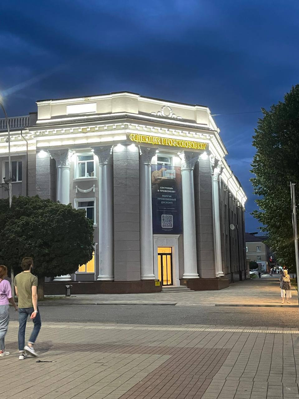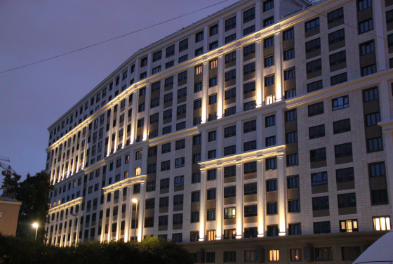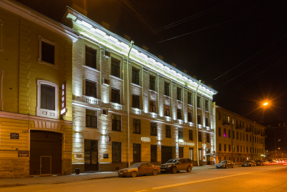 Фасад освещен в классическом для северной столицы, стиле. Сочетание линейной подсветки, венчающего карниза и лучевой подсветки, выполненной одно- и двухсторонними прожекторами.