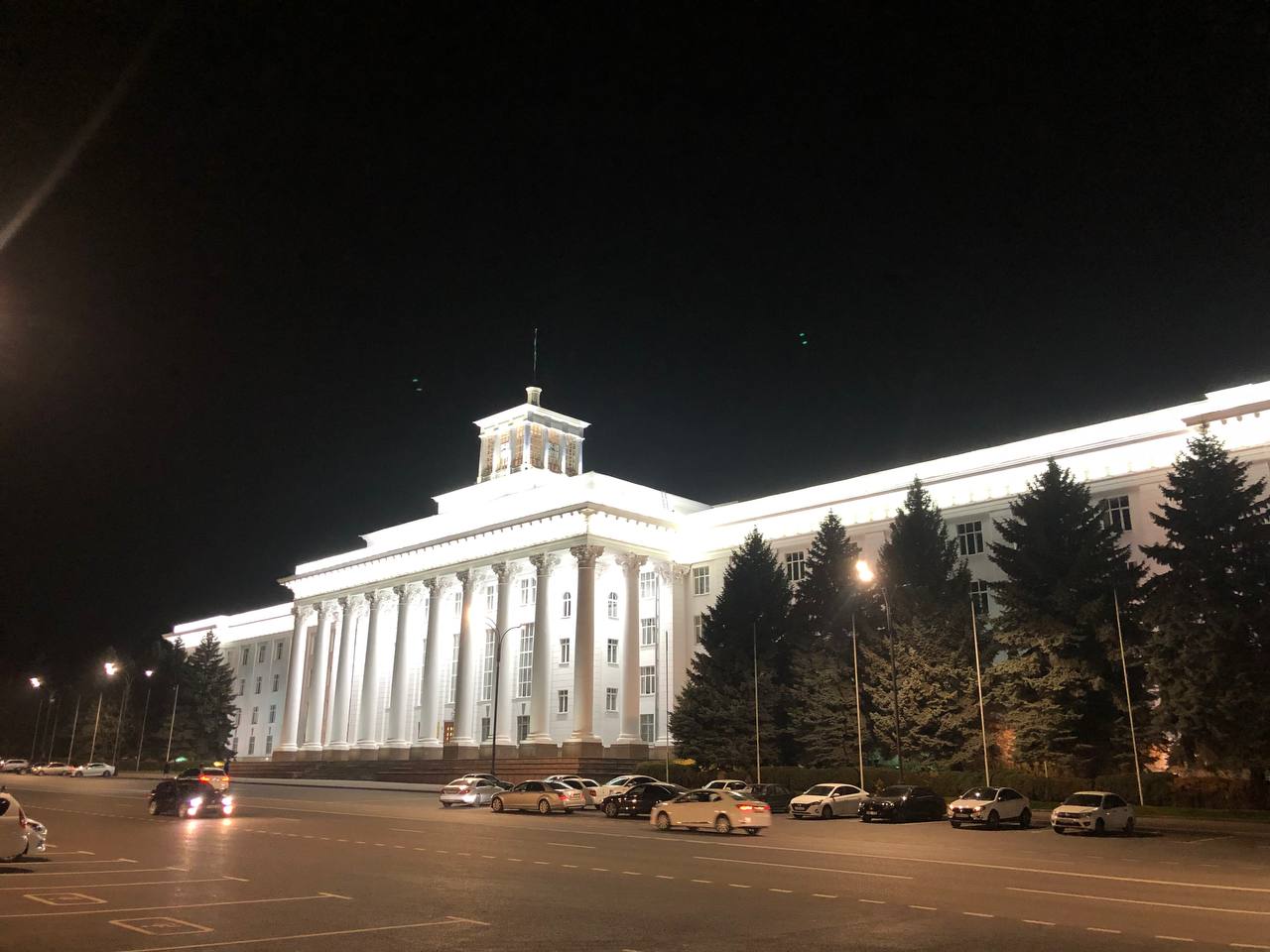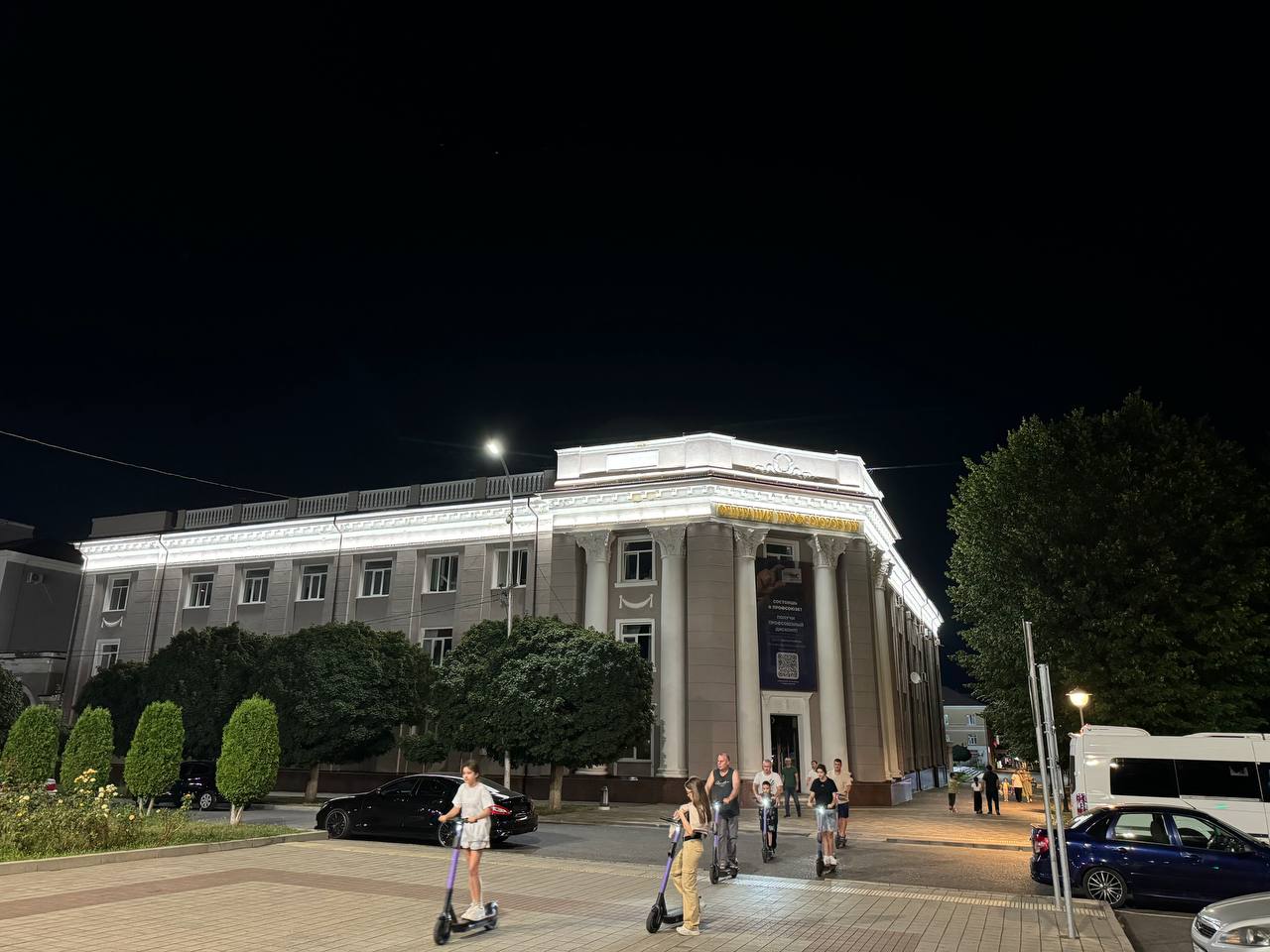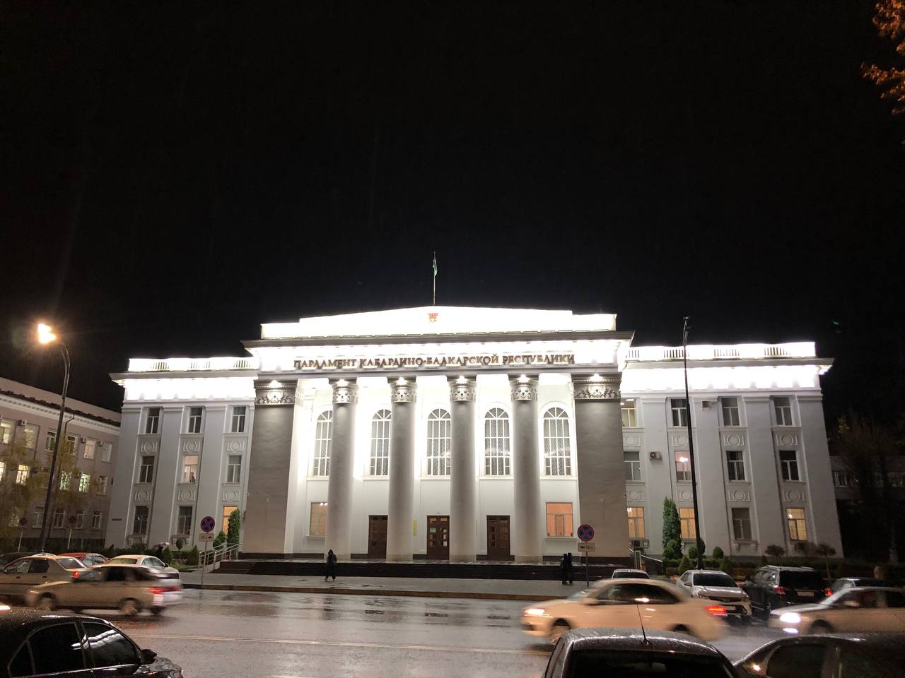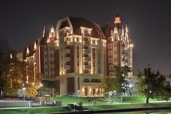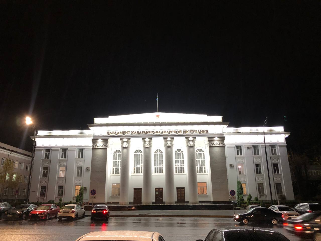 Фасад освещен в классическом для северной столицы, стиле. Сочетание линейной подсветки, венчающего карниза и лучевой подсветки, выполненной одно- и двухсторонними прожекторами.
