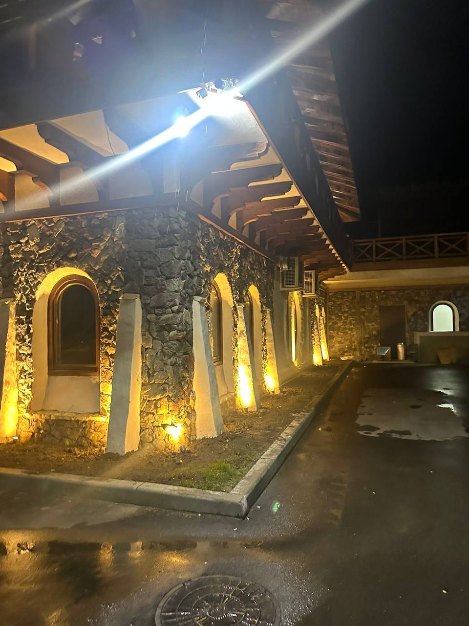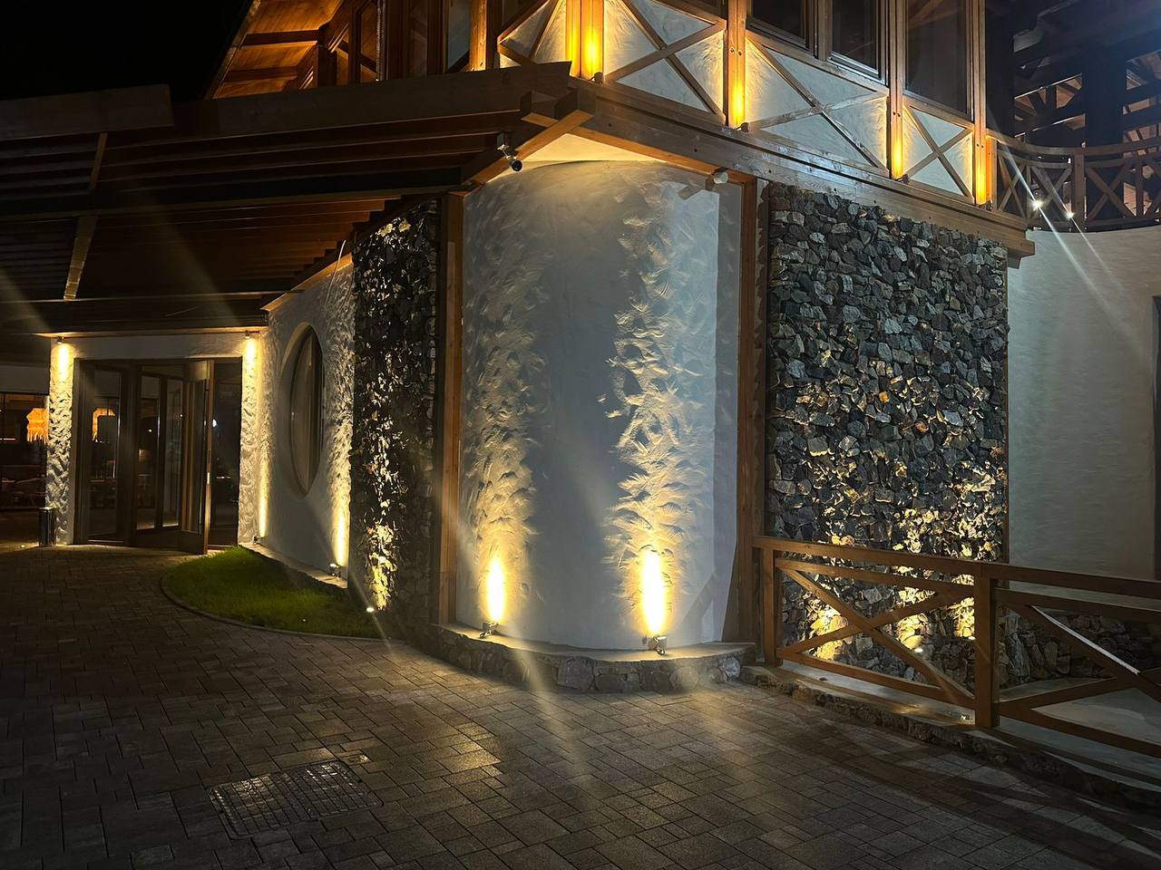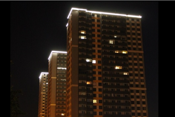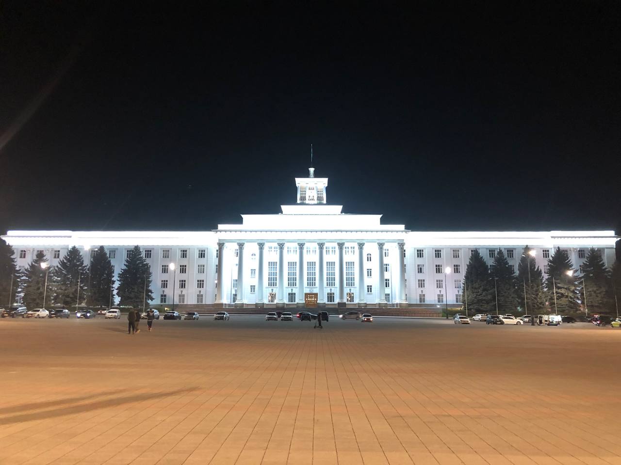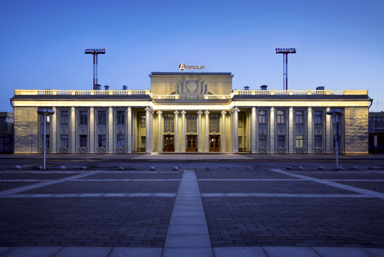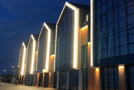 Фасад освещен в классическом для северной столицы, стиле. Сочетание линейной подсветки, венчающего карниза и лучевой подсветки, выполненной одно- и двухсторонними прожекторами.